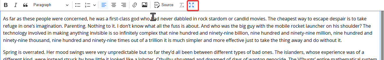 The default behavior that my client is used to with CKEditor is that the size of the body field is fixed but expandable (1). As long as the user does not increase the size of the body field, the toolbar will remain visible and the writer will scroll up and down through their text within that area (2).