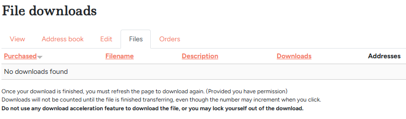 The customer account can log in and see the order, but there is 'No downloads found' shown under the Files tab: